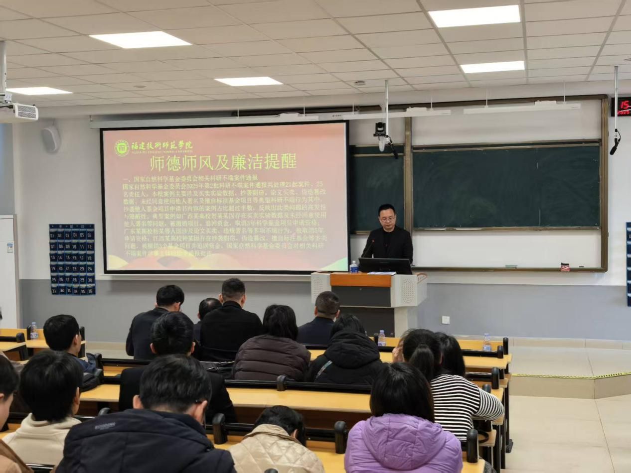 林景亮副书记以学习贯彻党的二十届四中全会精神为主线,紧扣为党育人、为国育才核心使命,围绕师德警示案例作专题授课。他号召全体教职工,日常工作生活中要遵守学校纪律、维护校园秩序,自觉遵守交通规则等社会规范;要强化意识形态工作,坚持正确政治方向,将为党育人、为国育才理念融入教学全过程;要坚守学术诚信,规范经费使用,杜绝抄袭、造假等不端行为;要严守廉洁自律底线,远离违法违纪行为,珍惜当前幸福生活。