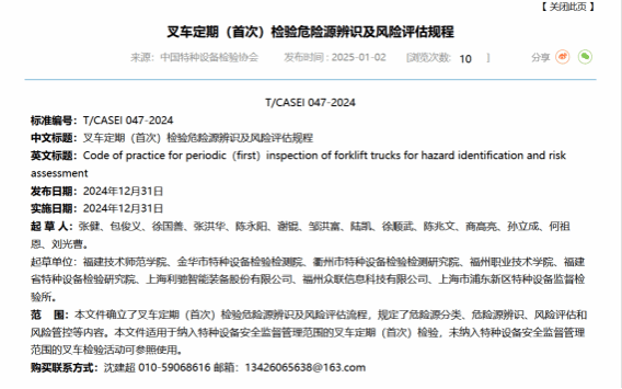近日,由我院张健教授级高工主编的1项国家一级协会团体标准--《叉车定期(首次)检验危险源辨识及风险评估规程》(T/CASEI 047—2024)由中国特种设备检验协会于2024年12月31日批准并发布实施。该标准由我校主编,其他单位有金华市特种设备检验检测院、衢州市特种设备检验检测研究院、福州职业技术学院等国内7家单位。