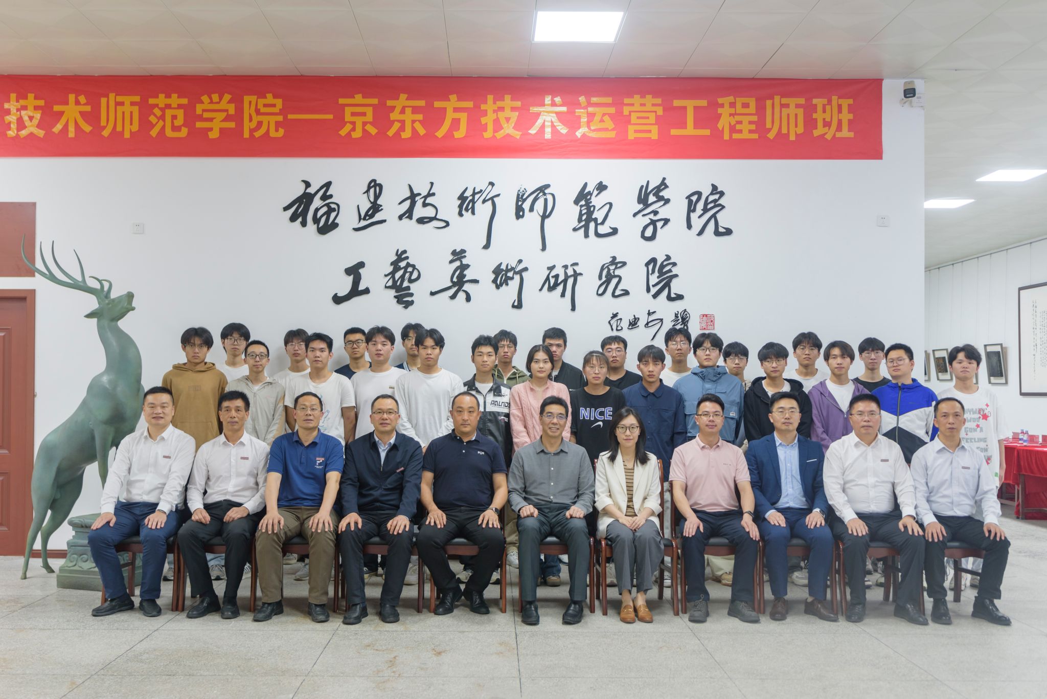 随后吴克寿院长和徐东亮总经理共同为福建技术师范学院—京东方技术运营工程师班揭牌,并为首批入选技术运营工程师班的25名学生发放学习用品。