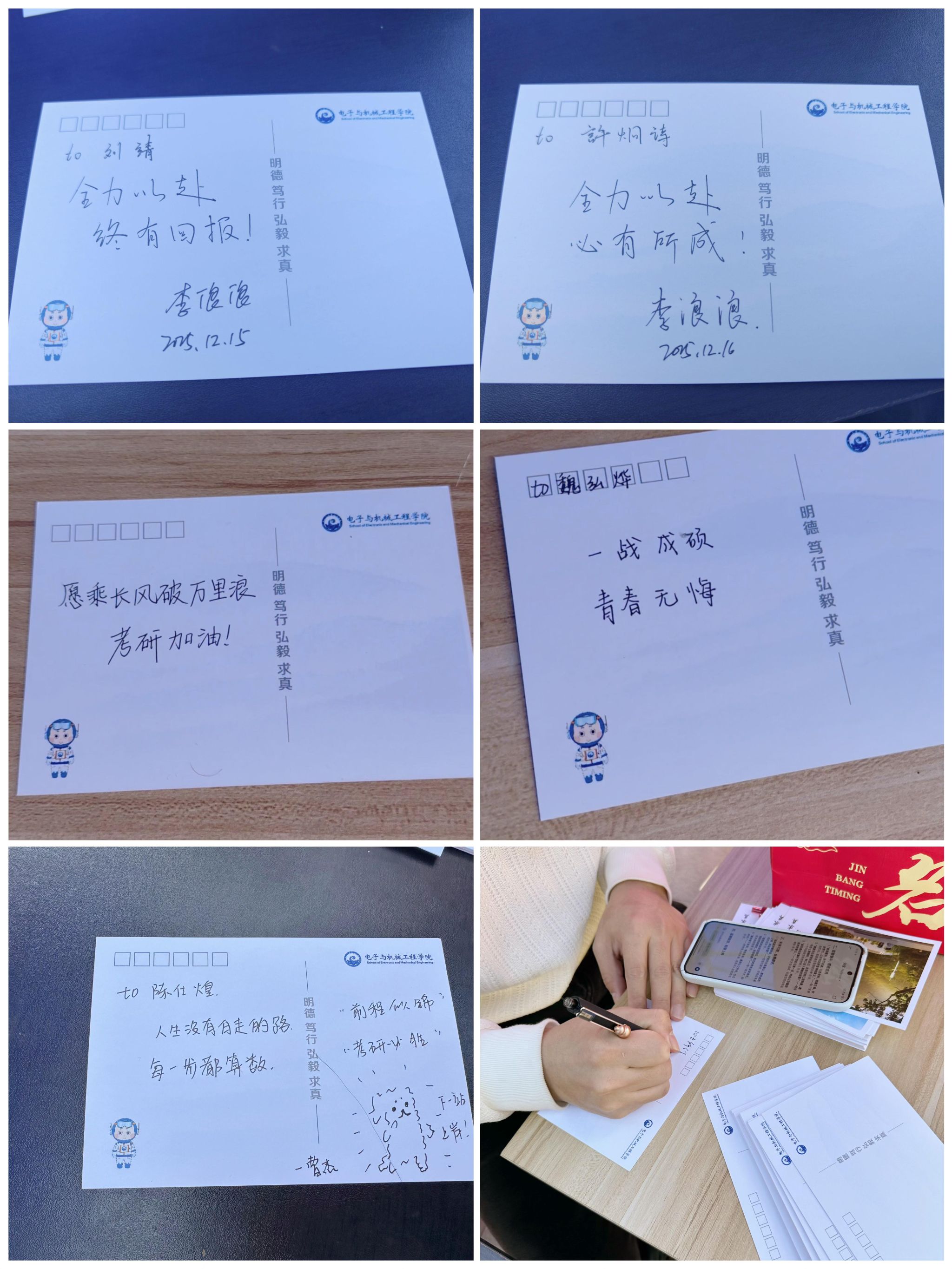 活动中,学弟学妹们用心执笔,在一张张明信片上写下“一战成硕”、“前程似锦”、“稳住心态,你是最棒的”等诚挚祝福语。辅导员老师们也亲笔寄语,勉励同学们沉着应战,发挥最佳水平。字里行间,传递着学院大家庭的温暖与守望相助的情谊。除了情感上的鼓励,学院还精心准备了实用且寓意美好的“考研加油礼包”。礼包内不仅有考试必备的文具用品,还包含了寓意“橙”心如意、心想事“橙”的新鲜橙子,以及为考生补充能量、提振精神的饮料。这份融合了美好祝愿与切实关怀的礼物,令收到礼包的考研学子倍感温暖与鼓舞。