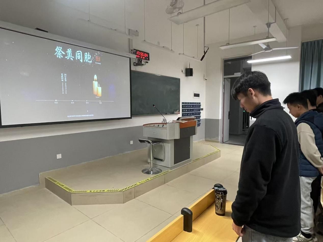 12月13日,学生第一党支部成员齐聚教室,庄严肃穆。投影屏幕上,“祭奠同胞”四个大字格外醒目,下方蜡烛图案与文字传递着对逝者的哀思。全体成员起立低头默哀,用3分钟的静默表达对30万遇难同胞的深切缅怀。